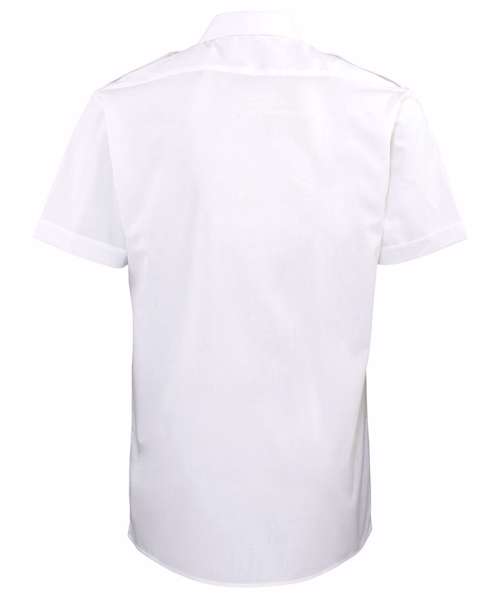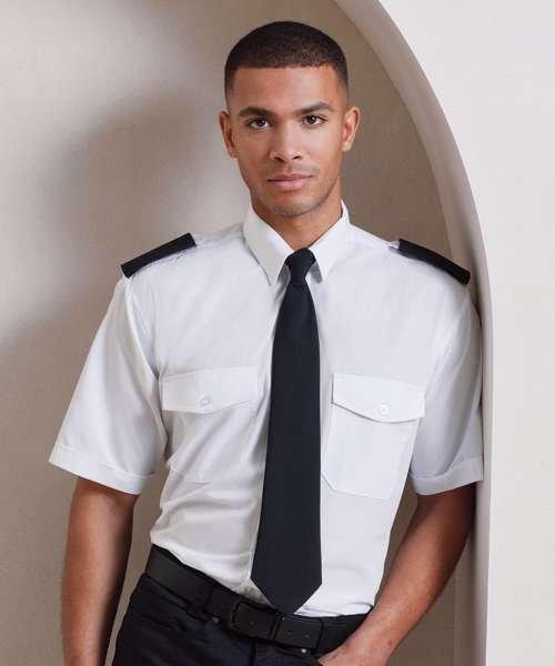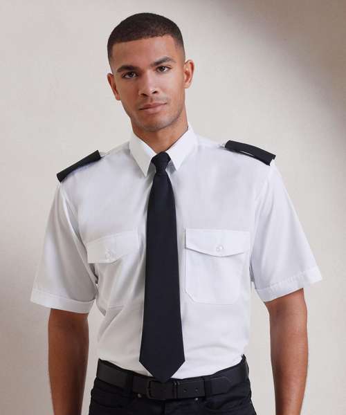 A men's short sleeved pilot/security shirt with a stiffened collar and tabs for epaulettes on shoulders for those who need a more authoritative approach to their workwear.