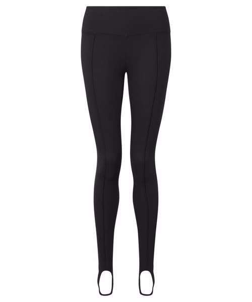 Full-length leggings. Soft-stretch fabric. Self-fabric waistband. Seam detail through centre. Elasticated stirrup design to feet. The product contains no branded neck or waist label. Removable kimble or looped garment tags. The inner seam label holds important product information on one label with a second label containing brand information which can be cut-away. We recommend using block out vinyl and inks.